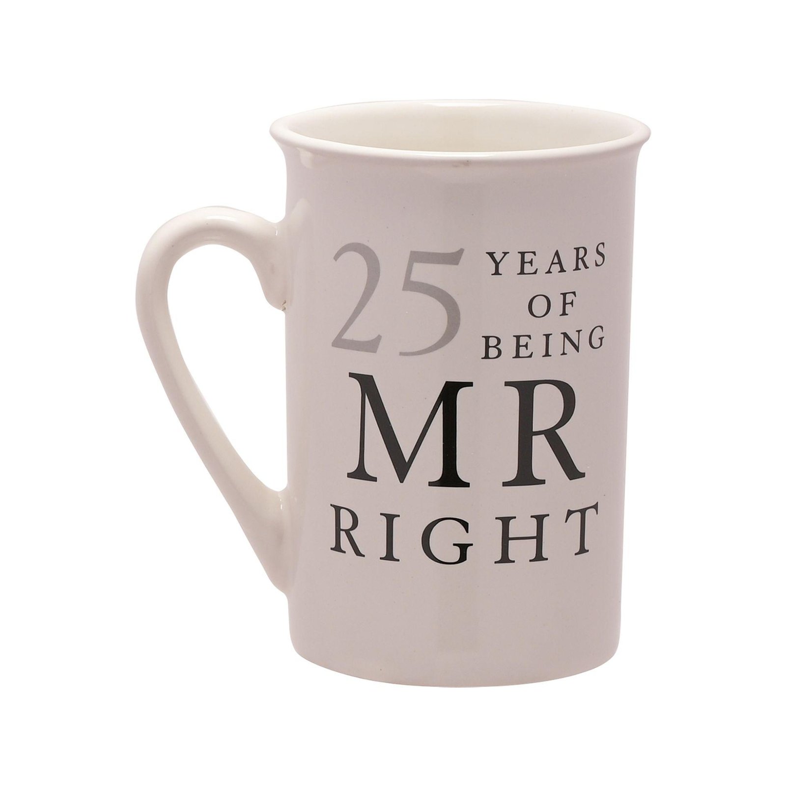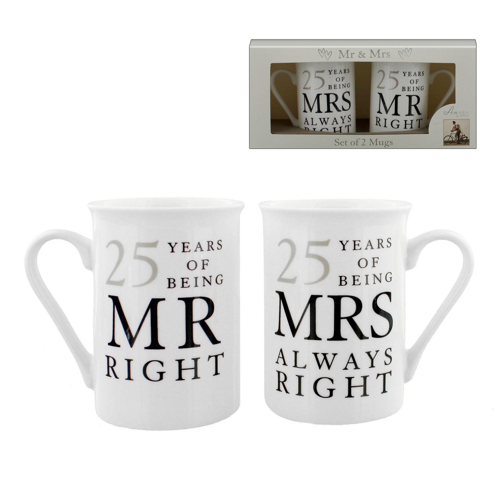 Each mug features the playful “25 Years of Being Mr Right / Mrs Always Right” design. Beautifully presented in a keepsake gift box, this anniversary mug set is ready to give straight away – a heartfelt present for parents, grandparents or friends celebrating their milestone.