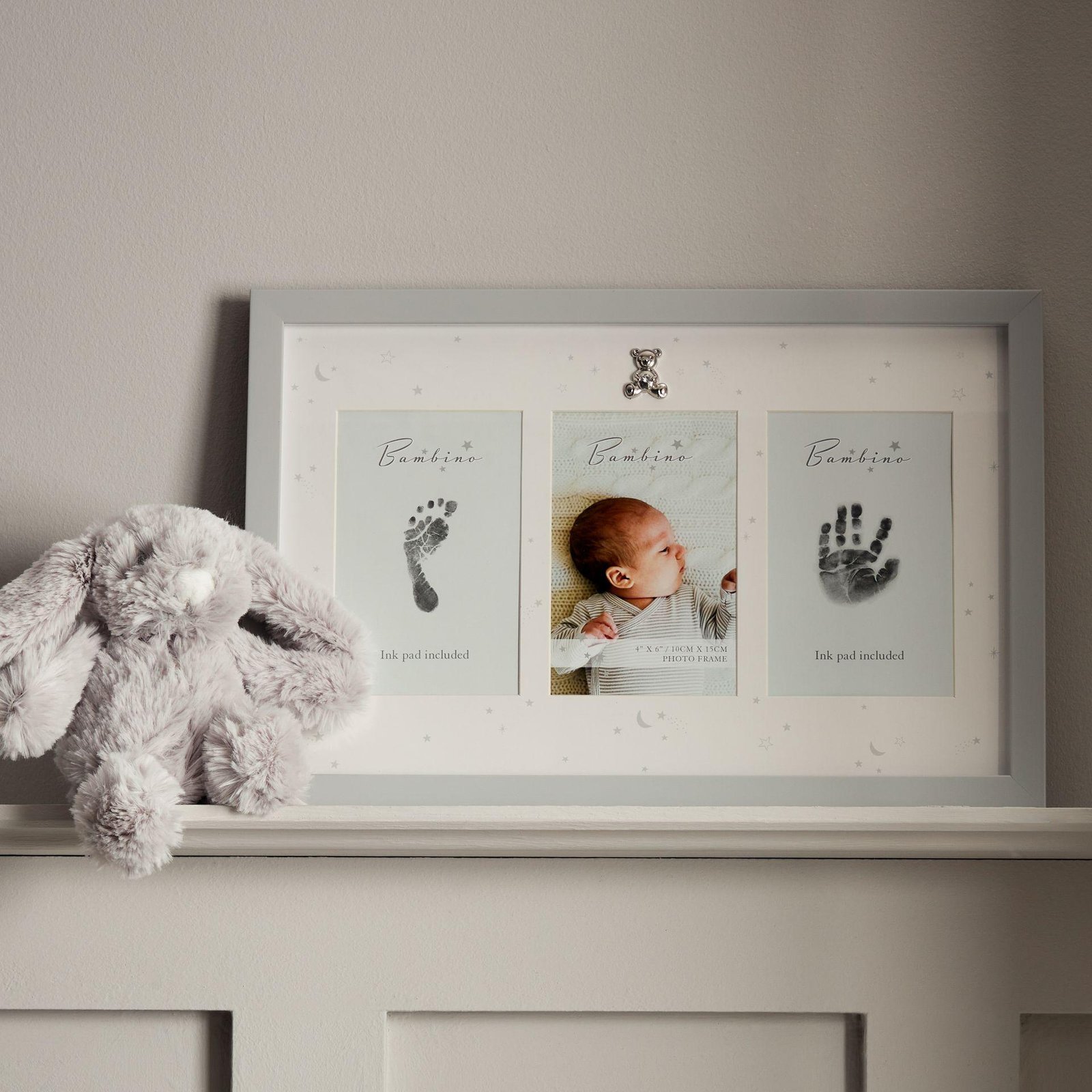 The elegant wooden frame features a matte finish and is complemented by a decorative mount and a silver-plated teddy bear icon adorned with crystals. This frame includes three apertures: one for a cherished baby photo and two for ink prints of your baby’s hand and foot, using the ink pad kit provided.