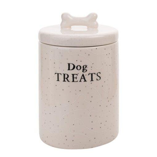 The jar is ceramic white with a black speckled finish and is cylindrical in shape. With recurring dog bone motifs in the design too, these all combine to make a great product.
