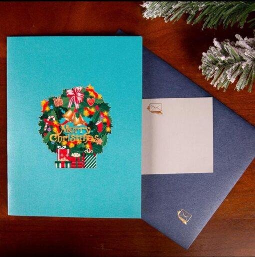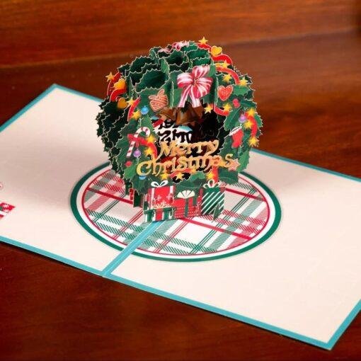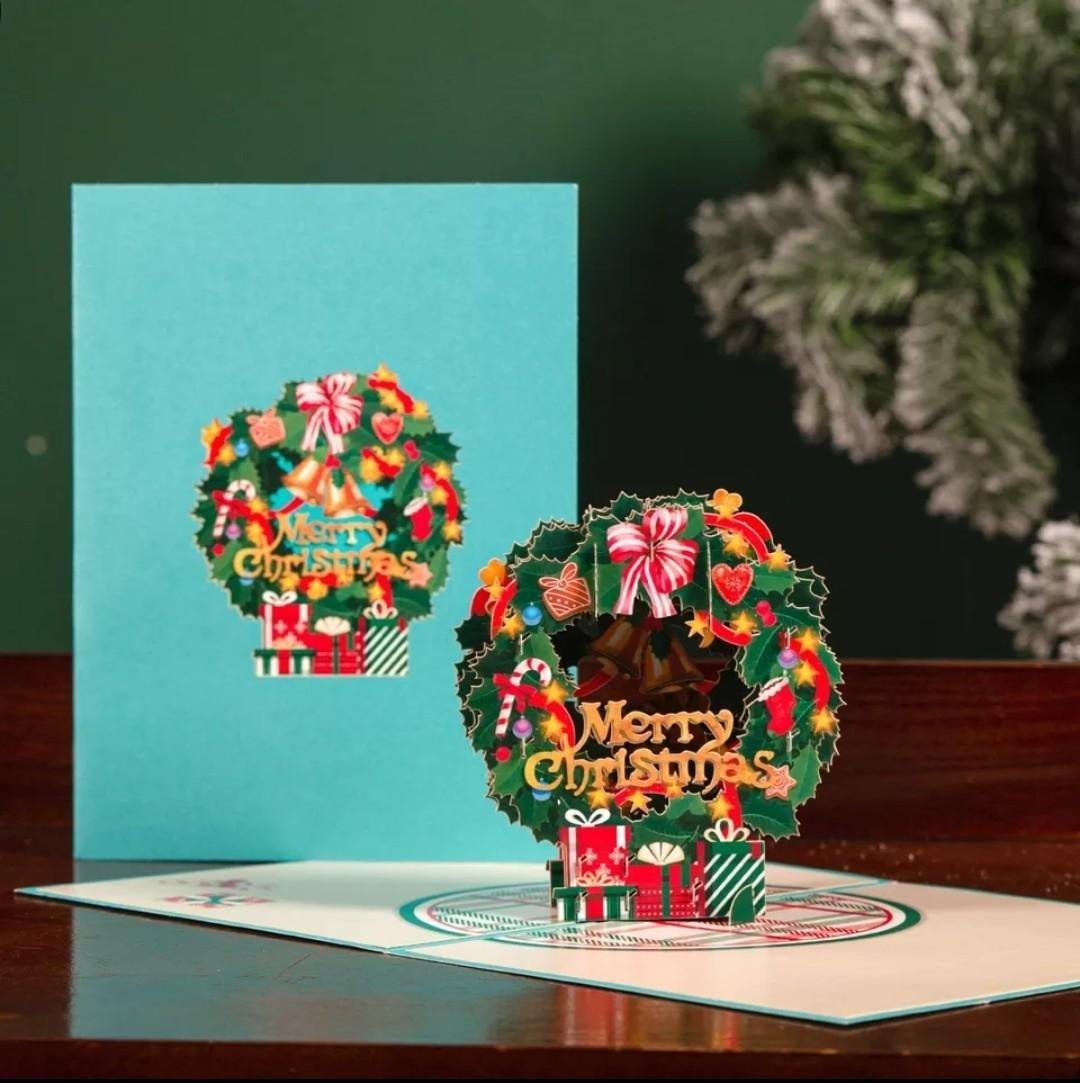 The card comes carefully packed flat but magically opens up to reveal a beautifully intricate, Christmas Wreath scene!