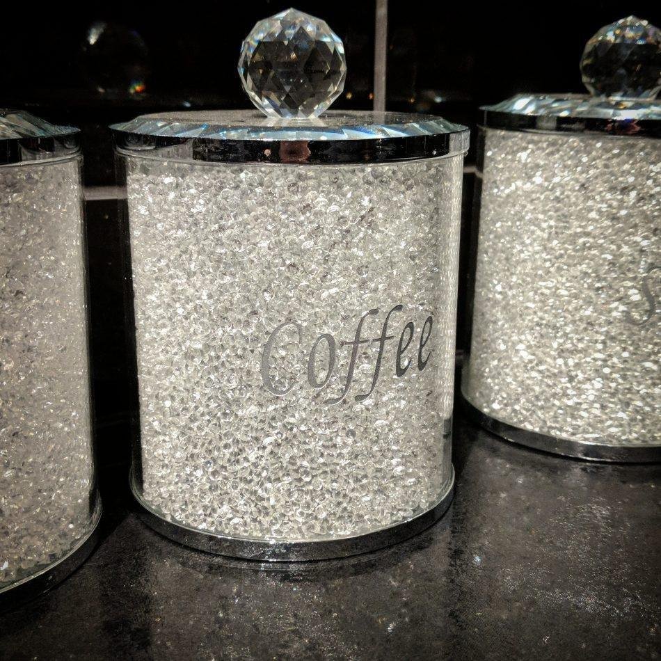 A stunning set of hand made Tea Coffee and Sugar Canisters filled with Swarovski Crystal Elements made by Diamond Affair.