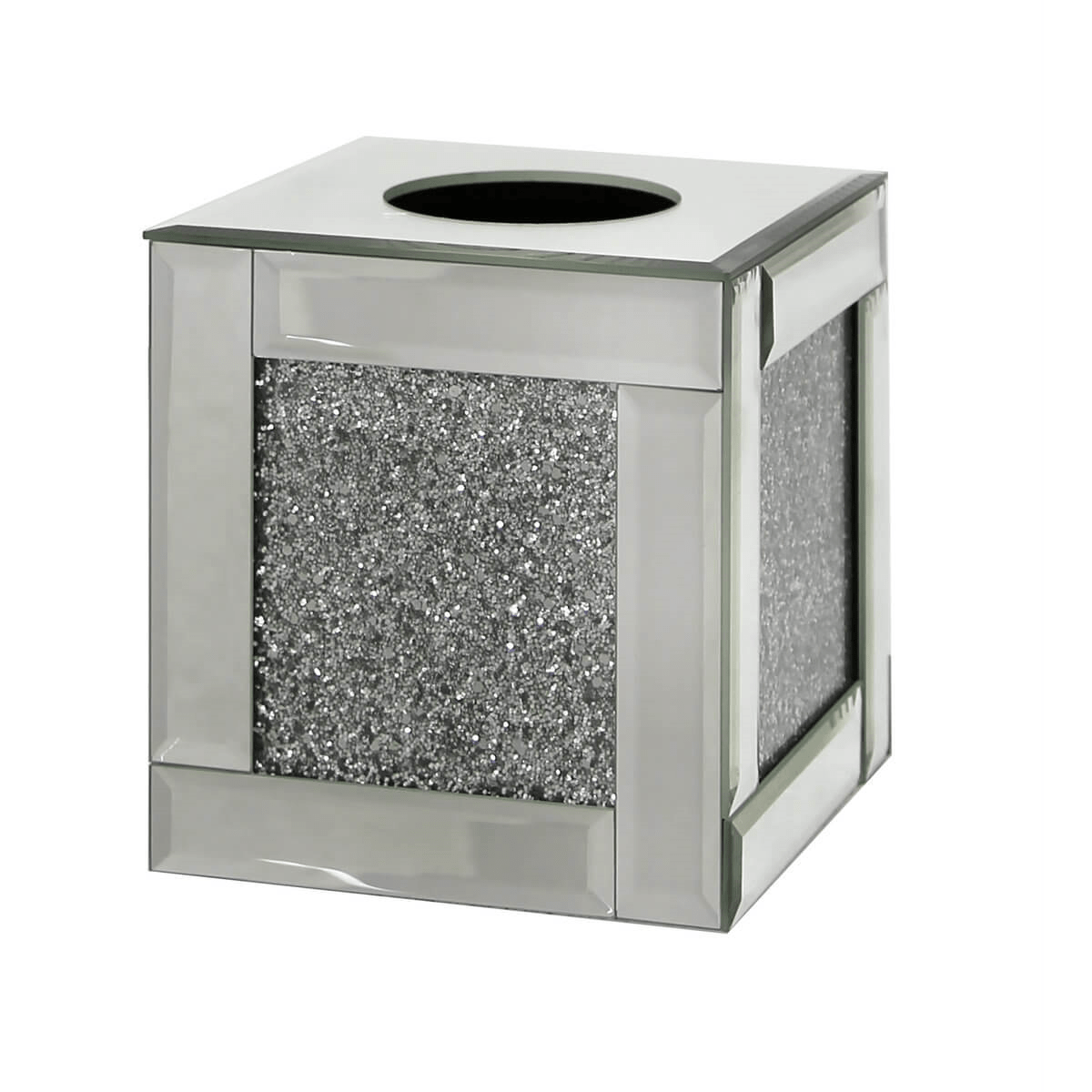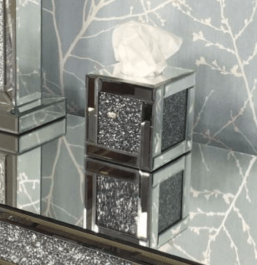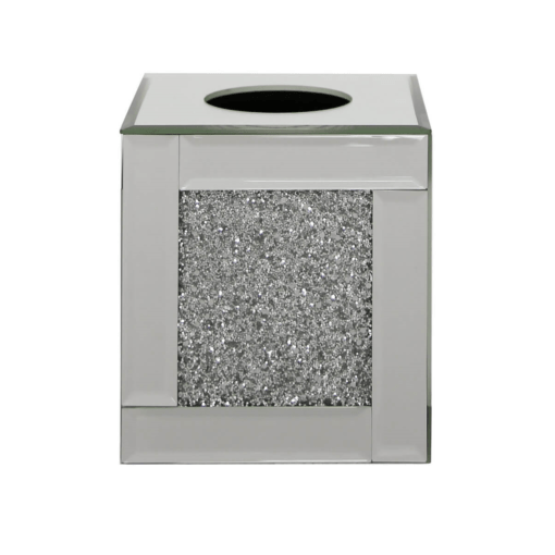 Add some sparkle to your home with this beautiful contemporary mirrored tissue box cover. Inlaid with strips of tiny mirror and silver crystals. This piece adds contemporary glamour to any interior.